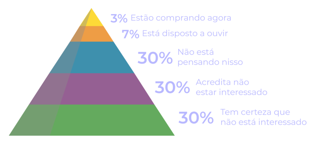 O gráfico foi feito baseado no interesse de compra dos consumidores, uma média que vale para qualquer segmento. Olhando para ele podemos ver que quando você divulga diretamente seus produtos ou serviços, você está se concentrando em apenas 10% do potencial do seu mercado.